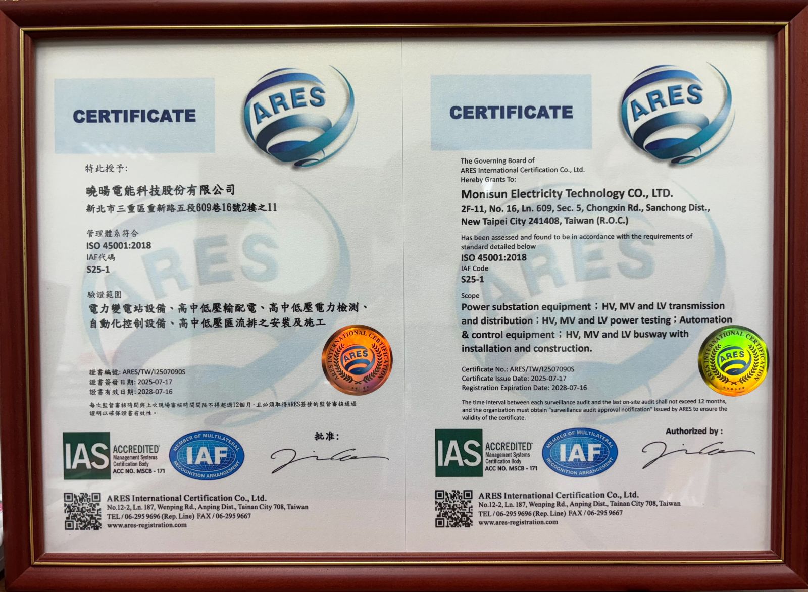 此次稽核由 亞瑞仕驗證公司(ARES International Certification Corp.)主導,歷經嚴謹審查與多次內部查核輔導後,最終通過驗證,肯定本公司在安全制度、風險預防、持續改善等面向之管理效能。